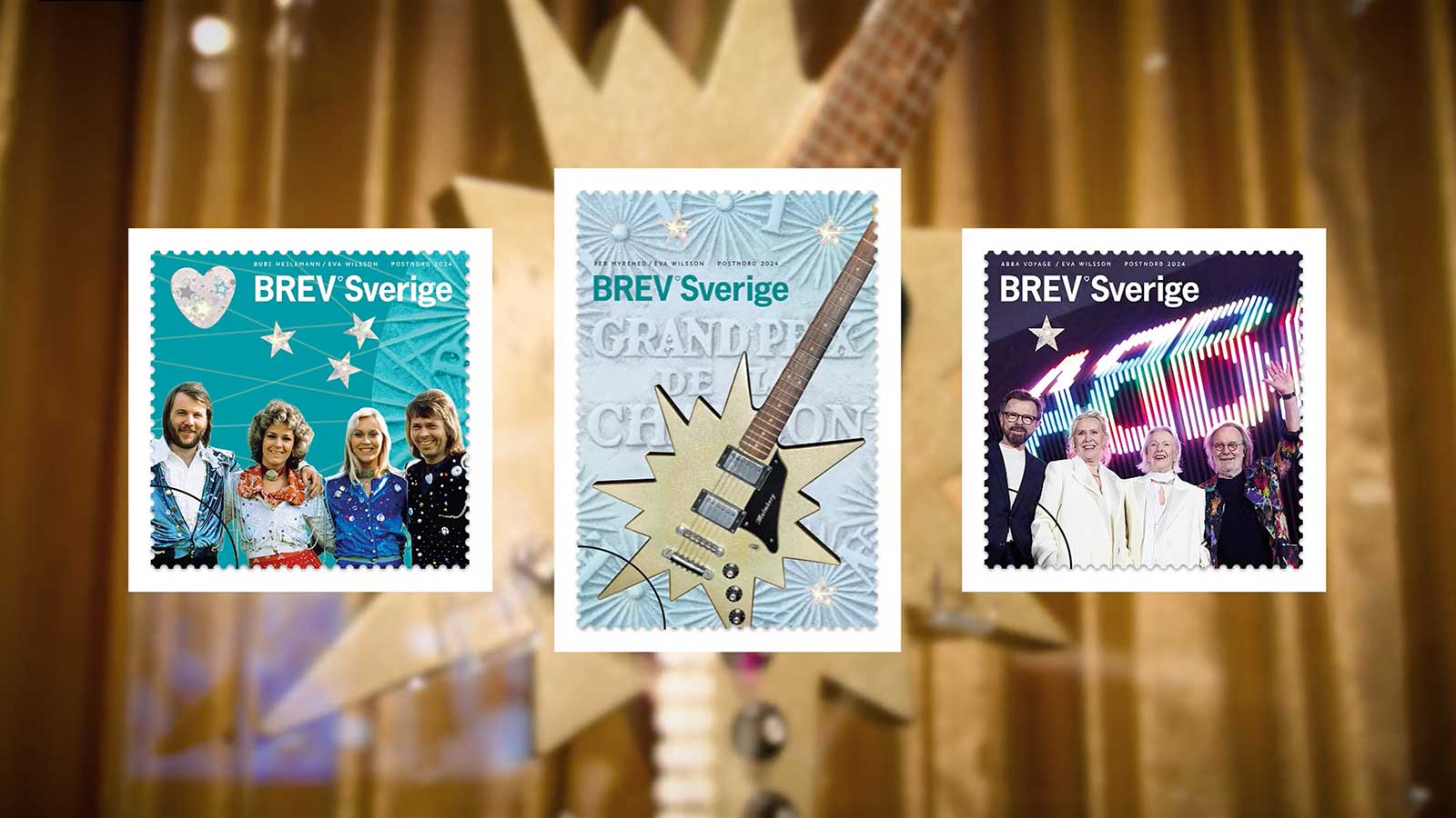 – Att låta stjärngitarren glänsa på frimärket i mitten var självklart. Björn spelade på en akustisk gitarr när ABBA vann Melodifestivalen 1974, sen kryddade han numret till Eurovision med den här galna gitarren som alla bara måste älska. Den är lackad och skimrar i guld.